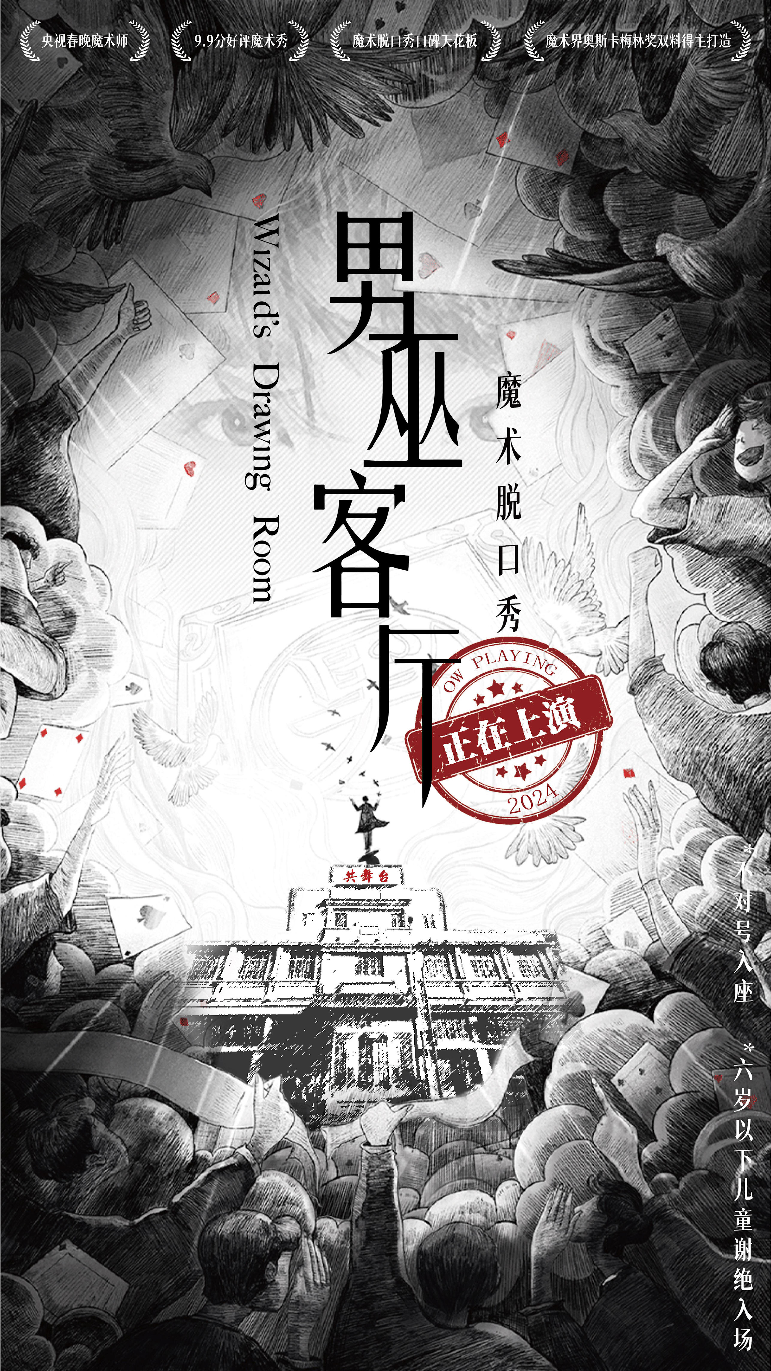 其巧妙融合近景魔术、舞台魔术与爆笑脱口秀,观众入场即获“家人”身份牌深度参与互动,单场互动率超80%。上海驻演期间评分高达9.8分,长期占据热门榜单,平均上座率超90%。凭借其颠覆性的沉浸体验与文商旅融合创新,《男巫客厅》2024年成功进驻北京天桥艺术中心并入选北京市首批市级演艺新空间,被央媒誉为“打破第四堵墙的审美革新”。